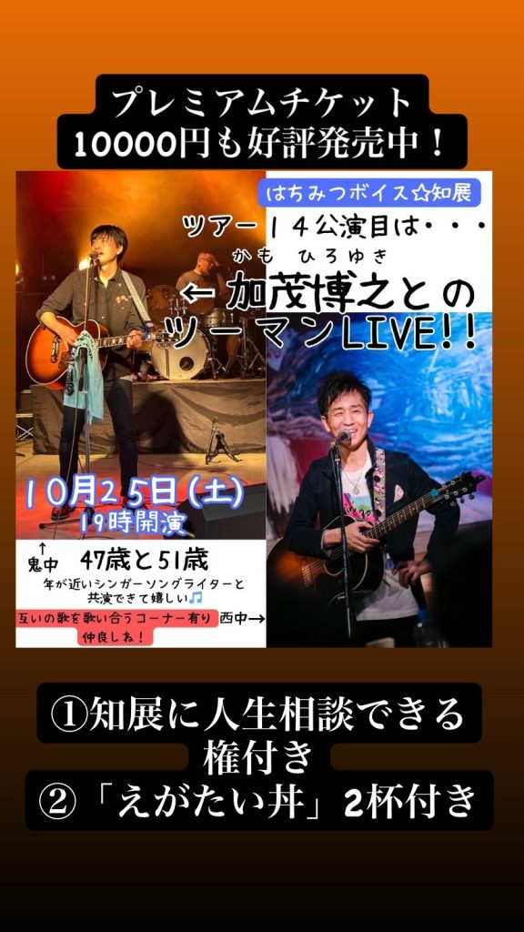 という事ではちみつボイス☆知展の爆笑トークと歌を楽しんで頂きたく、10月25日(土)と12月7日(日)に地元唐津でライブを開催致します!