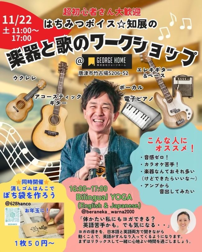 アコースティックギター、ピアノ、ウクレレ、ベースギター、エレキギター、そして歌のミニレッスンが受けられます😊