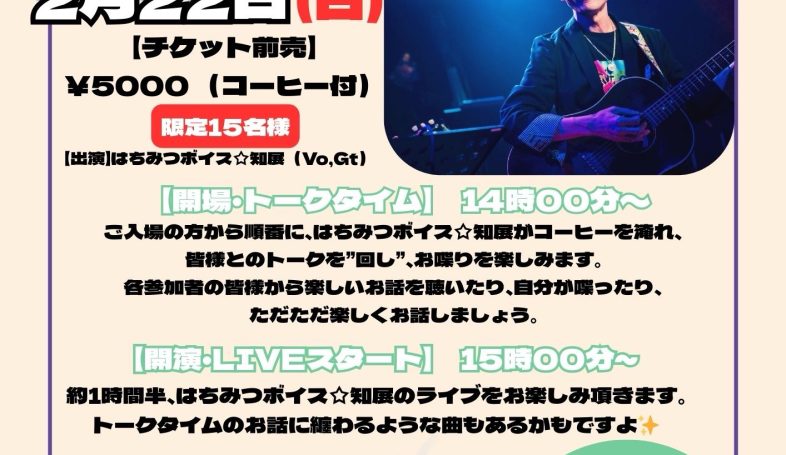 30周年ライブツアーの日程【はちみつボイス☆知展 シンガーソングライター活動30周年記念LIVEツアー-ありがとうの数-】 ●2月22日(日)唐津「ジョージホーム内モデルハウス」昼公演