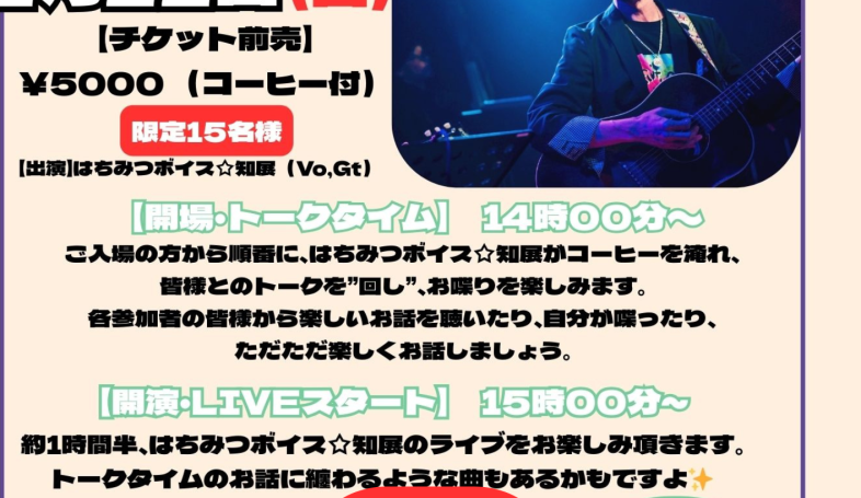 ほとんどフリートーク池田輝郎さんと、2月20日(金)の「池田輝郎誕生会」の打ち合わせでした! はちみつボイス☆知展は司会とギター伴奏を担当しまして、「はちみつボイス☆知展ミニライブ
